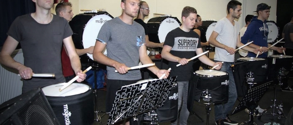 Waar in de ochtend warm-ups, oefeningen en cadences de boventoon voeren, gaan we ’s middags al over tot het instuderen van een stuk van de nieuwe show. Na de repetitie in secties speelt de battery voor het eerst gezamenlijk en het moet gezegd; dat stond al behoorlijk!